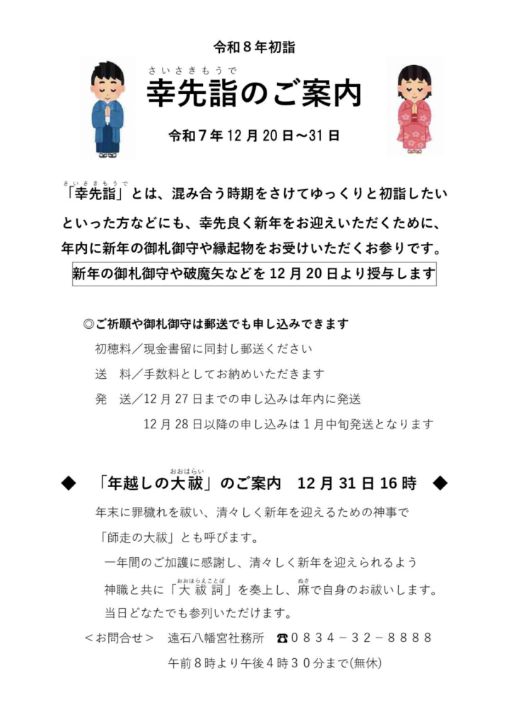 御祈願のご予約は不要です。直接遠石八幡宮へお越しください。